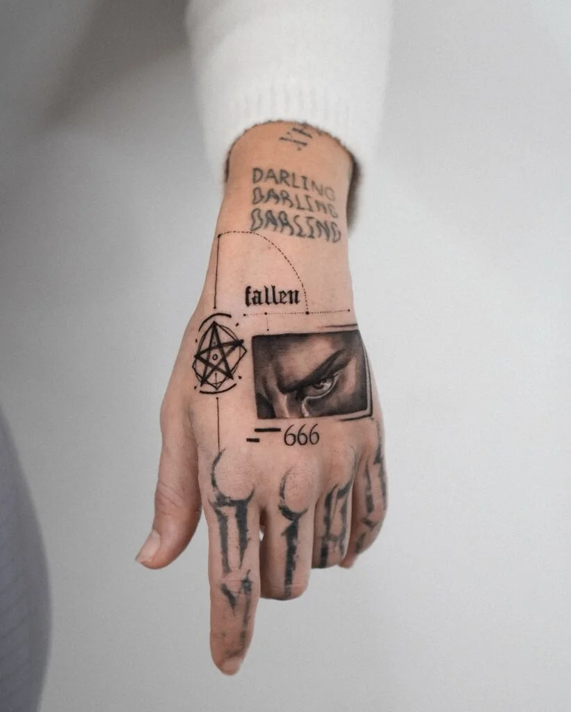 This bold and cinematic hand tattoo features a dramatic close-up of an intense eye, framed like a film still. Above it, the word “fallen” is carefully lettered, and below the image is the number “666,” creating a dark and mysterious vibe.
