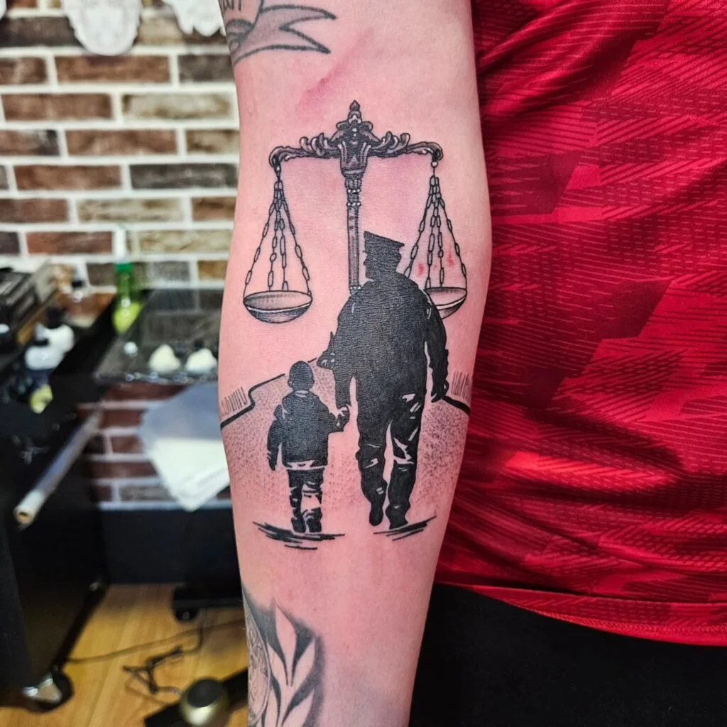 This tattoo shows a touching silhouette of a father and his young son walking hand in hand. The figures are inked in black, with the child’s small stride echoing the father’s steady steps. The placement on the forearm allows the emotional design to remain close and visible.