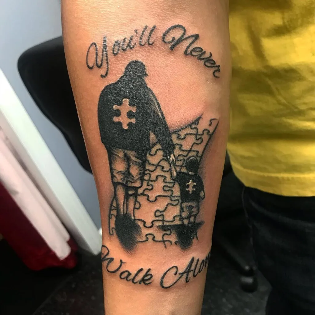 This tattoo features a heartfelt image of a father and son walking hand in hand across a puzzle piece path. Each figure has a puzzle piece cutout on their back, symbolizing how they complete each other. Above and below the artwork are the words “You’ll Never Walk Alone,” adding emotional depth and a message of unwavering support.