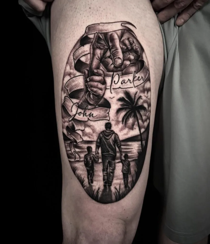 This deeply moving tattoo tells a full story of fatherhood. At the top, large hands hold a baby’s tiny hand and foot, each wrapped in flowing banners bearing the names “John” and “Parker.” Below, a father walks on a beach at sunset, holding hands with two children, capturing a quiet, loving moment.