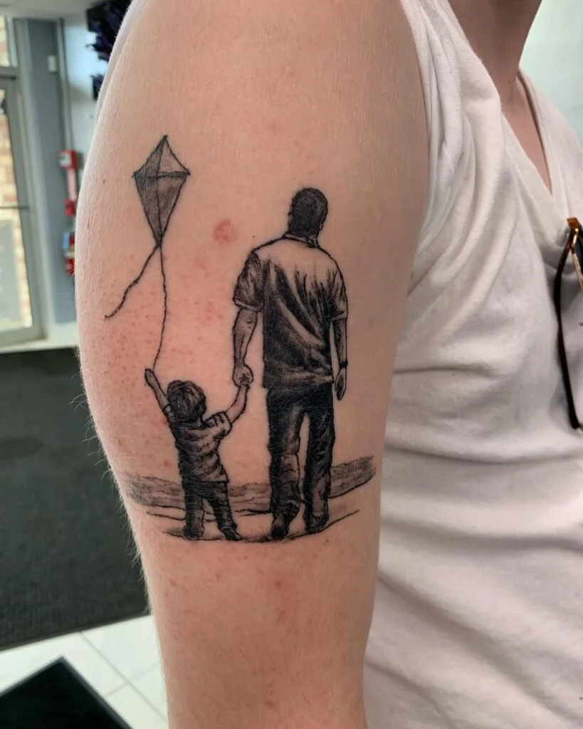 This tattoo captures a heartwarming moment between a father and his young son, standing side by side and holding hands. The child holds a kite string, adding a playful, carefree element to the scene. The minimalist black and grey shading gives it a timeless feel, while the realistic detail makes the bond feel genuine.