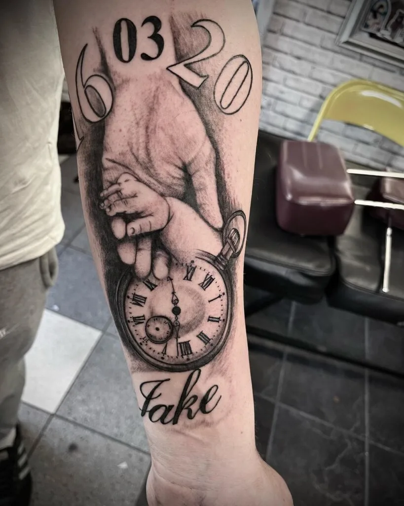 This striking black and grey tattoo features a large adult hand holding a tiny baby’s hand, symbolizing trust and protection. A detailed pocket watch sits below, capturing the preciousness of time. Above the hands is a date, likely marking the child’s birth, while the name “Jake” adds a personal touch.