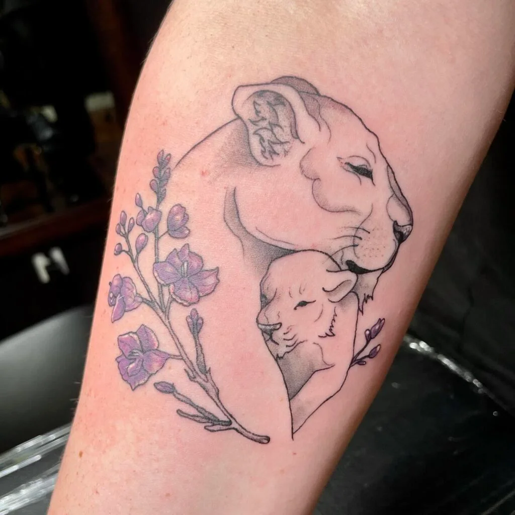 Lioness and Cub Tattoo with Lavender Blossoms