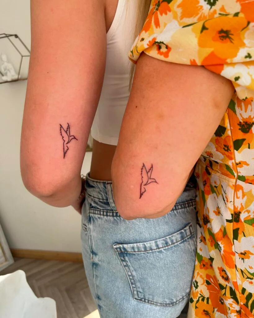 These matching tattoos feature the clean outline of a hummingbird in flight, inked near the elbow on both wearers. The design is simple yet expressive, with just enough detail to capture the elegance and speed of this tiny bird.