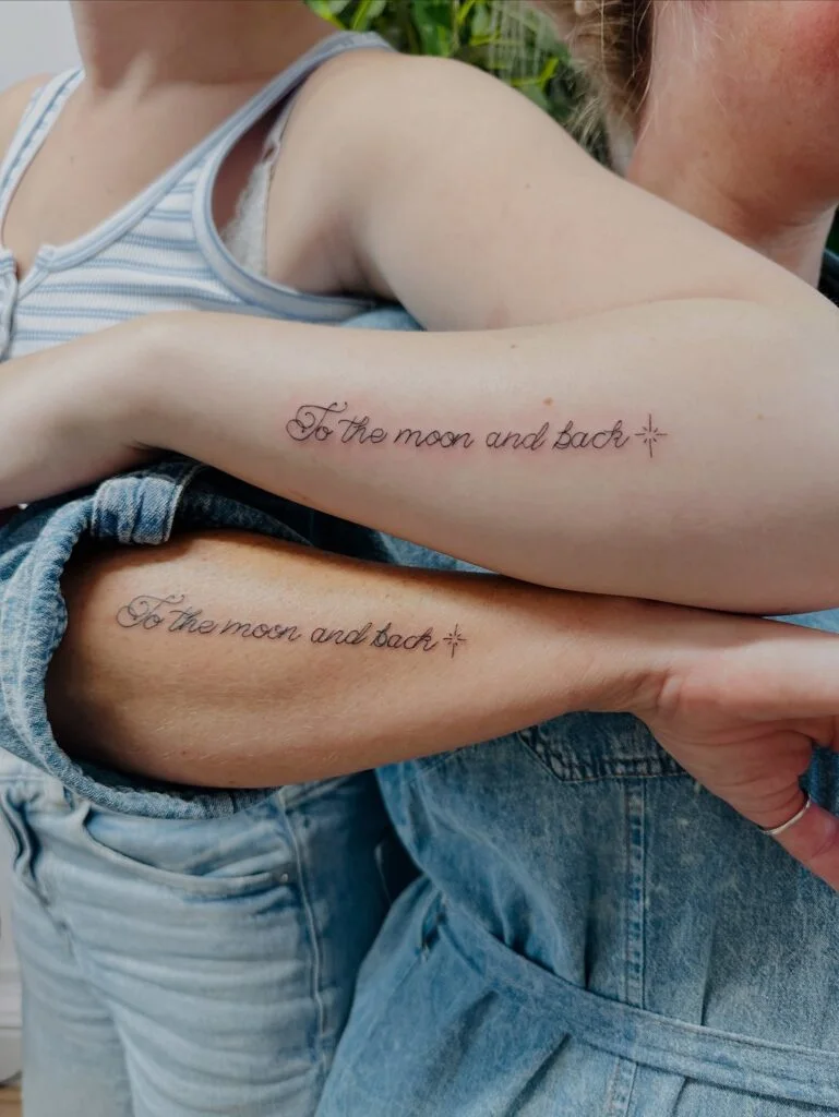 These matching tattoos feature the heartfelt phrase “To the moon and back” in elegant cursive script, accompanied by a tiny star sparkle at the end. Inked along the outer forearms, the phrase wraps softly around the arm, symbolizing immeasurable love and devotion.