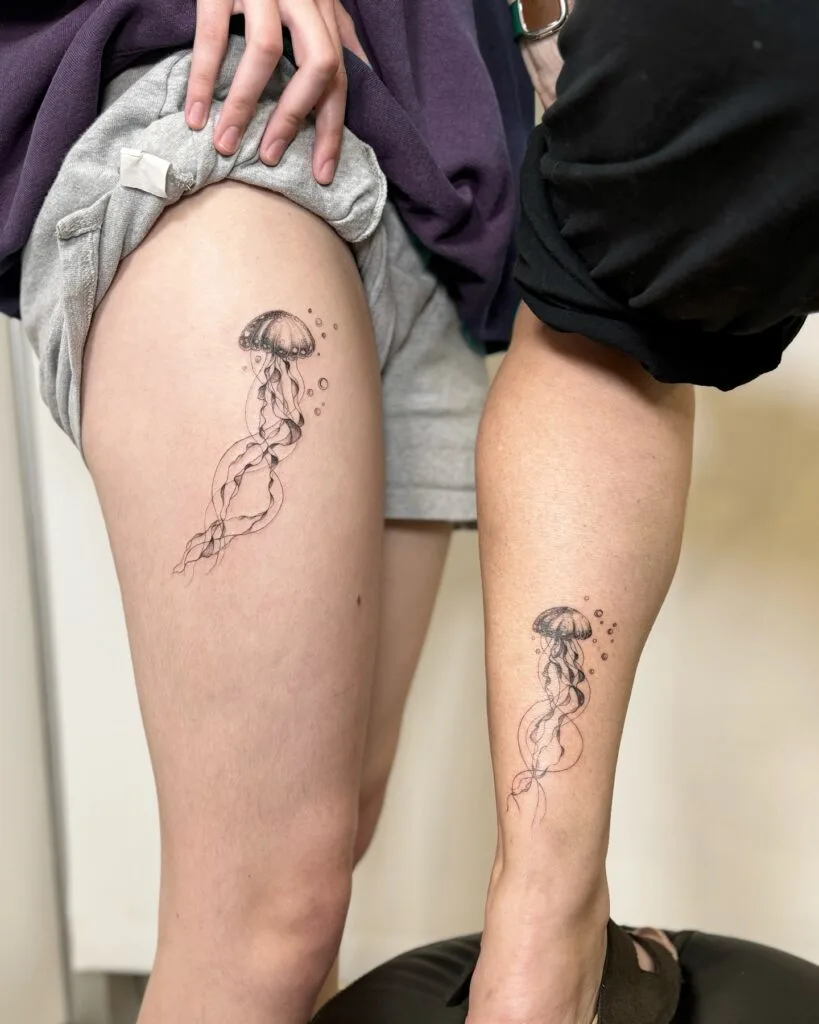 These beautifully matched tattoos depict graceful jellyfish drifting through water, complete with delicate tendrils and surrounding bubbles. One design appears on the thigh, the other on the lower leg, symbolizing individuality within shared meaning.