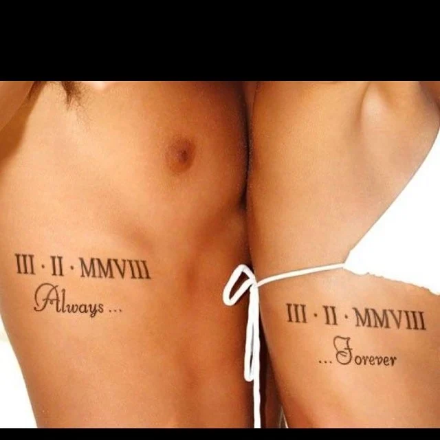 Placed on their ribs, these matching tattoos serve as a personal and intimate reminder of their bond. The combination of classic numerals and meaningful words creates a timeless design that perfectly represents their promise to stand by each other through life’s journey.