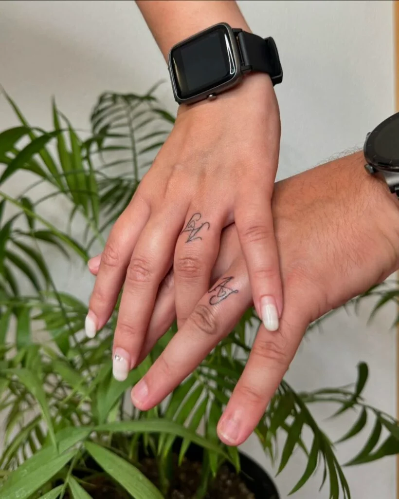 This couple’s tattoos feature beautifully designed initials inked on their ring fingers, symbolizing their deep connection and commitment. The elegant script adds a romantic touch, making these tattoos a meaningful alternative to traditional wedding bands.