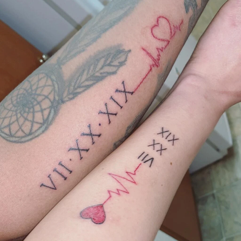 This husband and wife tattoo set combines Roman numerals and heartbeat lines, symbolizing a love that keeps their hearts beating in sync. Each partner has the same date inked in elegant numerals, marking a significant moment in their relationship.
