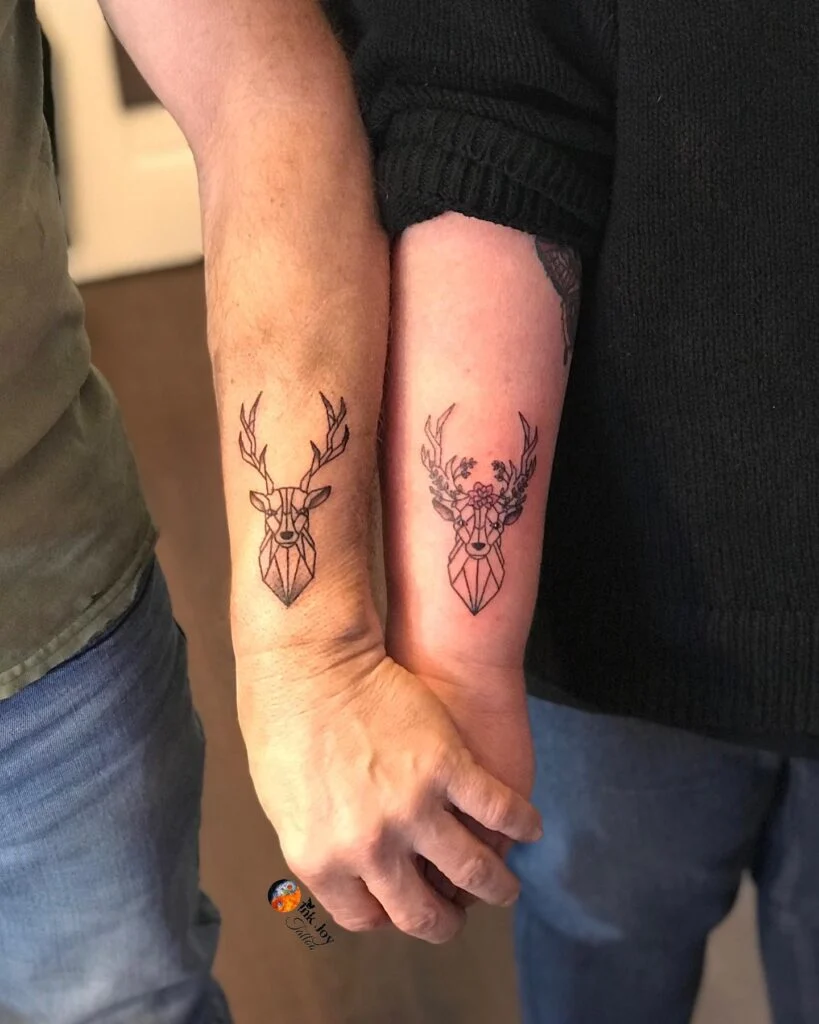 This matching tattoo set features a geometric deer on each partner’s forearm, symbolizing love, loyalty, and harmony in nature. The husband’s design showcases a bold, angular stag, representing strength and protection. The wife’s version includes delicate floral details woven into the antlers, adding a soft, elegant touch.