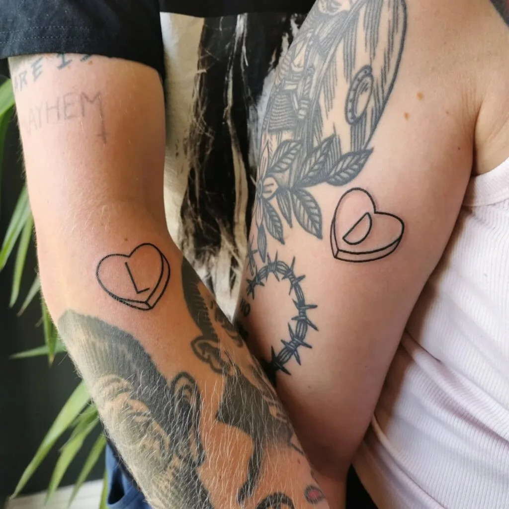This matching tattoo set features two outlined candy hearts, each with a letter inside—one marked with an “L” and the other with a “D.” The design is simple yet deeply personal, symbolizing the couple’s initials in a way reminiscent of nostalgic Valentine’s Day candies.