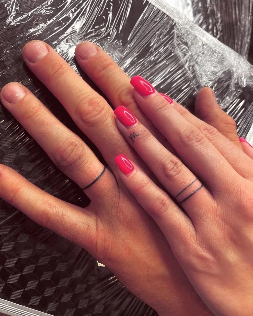Alongside her bands, she also has a small letter “m” inked on her finger, possibly representing a special name or word. These minimalist tattoos serve as timeless representations of their bond, replacing traditional rings with inked love that will never fade.