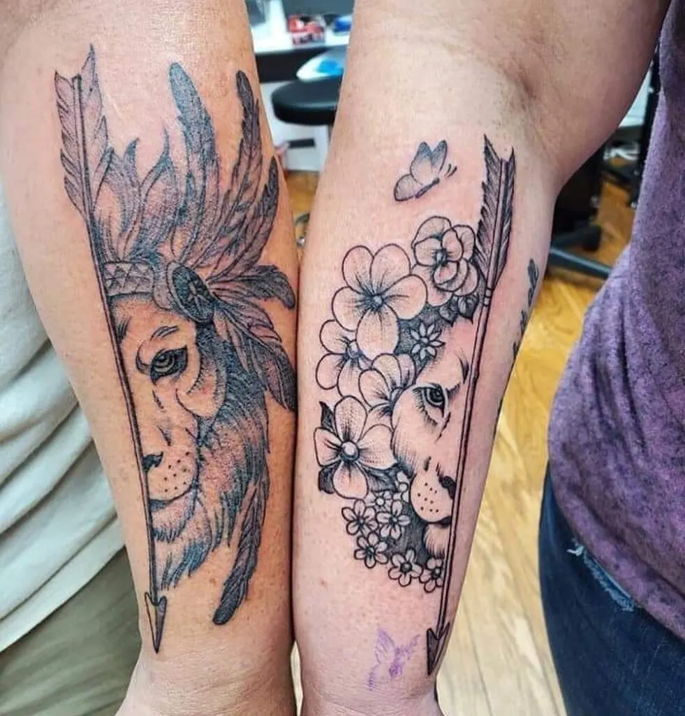 This striking couple’s tattoo features a lion and lioness, symbolizing strength, unity, and deep love. A single arrow divides the designs, representing their separate identities while remaining connected. The husband’s lion is adorned with a feathered headdress, reflecting courage and leadership, while the wife’s lioness is surrounded by delicate flowers and a butterfly, signifying grace and beauty.
