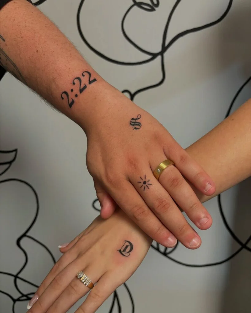 This couple’s matching tattoos feature a collection of meaningful symbols. One partner has “2:22” inked on their wrist, likely signifying an important time or angel number, alongside a stylish “S” symbol. The other partner sports a delicate sun tattoo on a finger and a beautifully scripted “D” on the hand.