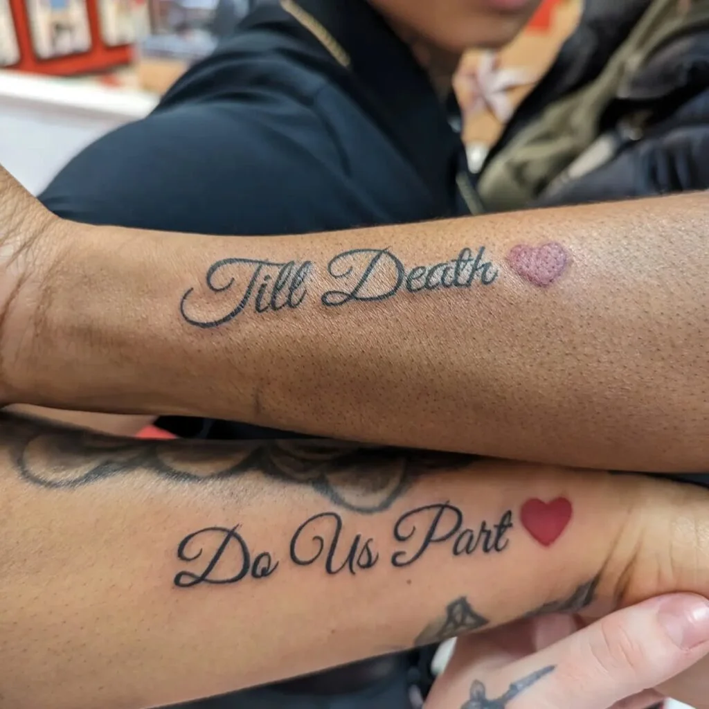 This matching couple’s tattoo beautifully represents lifelong commitment with the classic phrase “Till Death” on one partner’s arm and “Do Us Part” on the other. The elegant script adds a timeless touch, while the small red hearts bring warmth and romance to the design.
