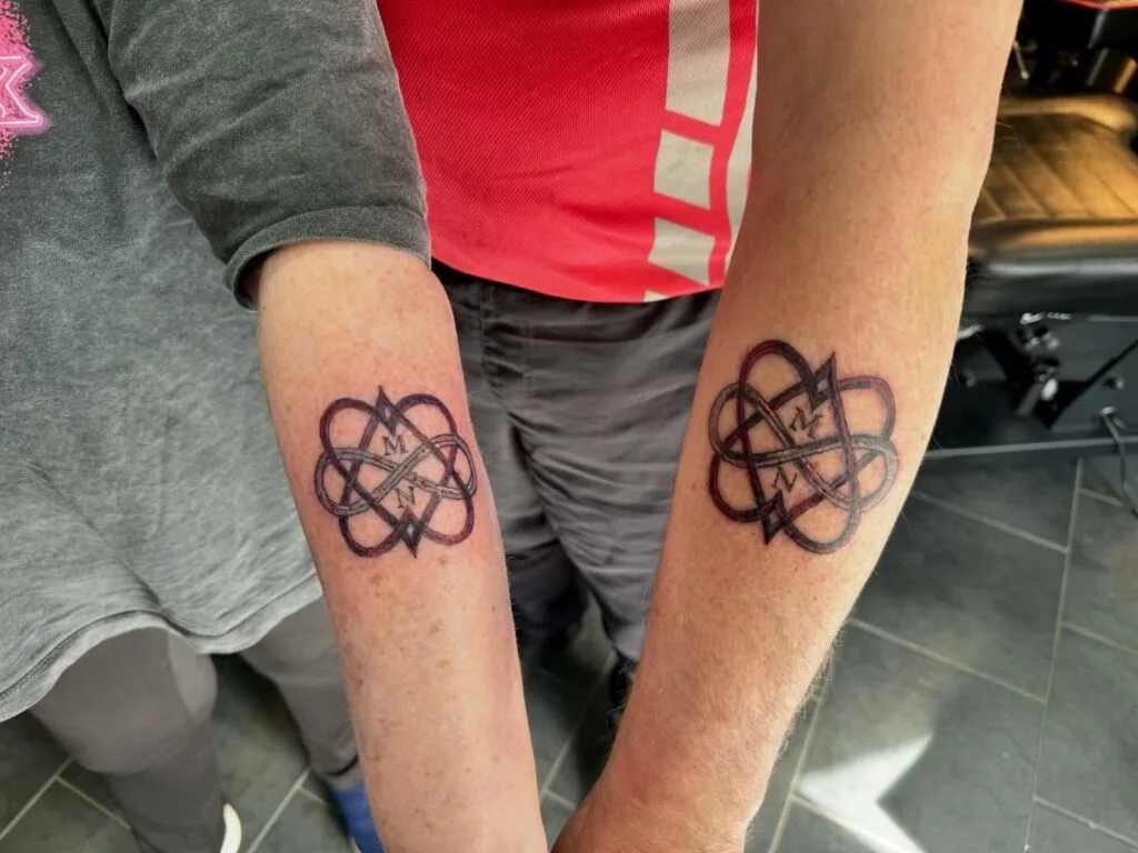 This matching couple’s tattoo features an intricate infinity knot design, symbolizing eternal love and an unbreakable bond. The looping patterns form a harmonious balance, with each tattoo personalized by the initials “M” and “N” at the center.