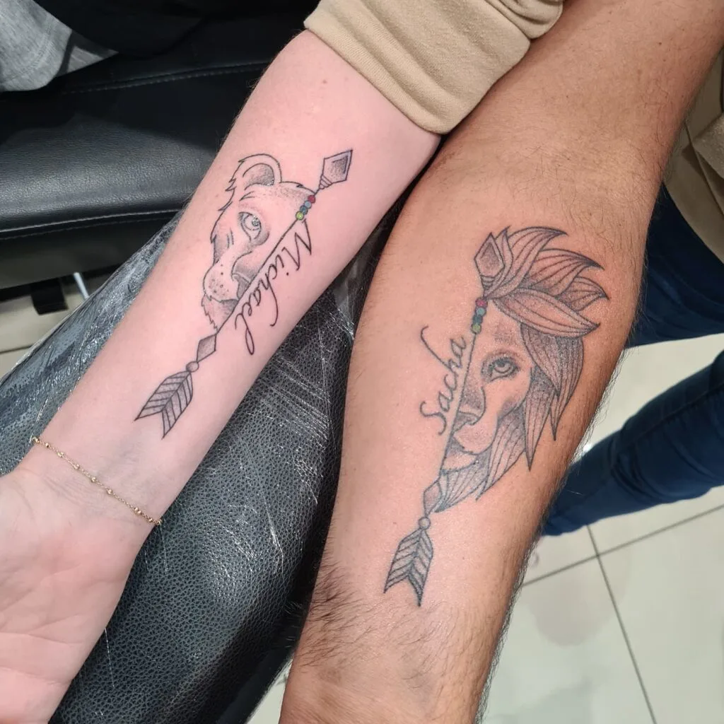 This couple’s matching tattoos showcase a beautifully detailed lion and lioness, each inked with their partner’s name. The lion, adorned with tribal-style feathers, symbolizes strength and protection, while the lioness exudes elegance and grace. A single arrow runs through both designs, visually connecting them as one.