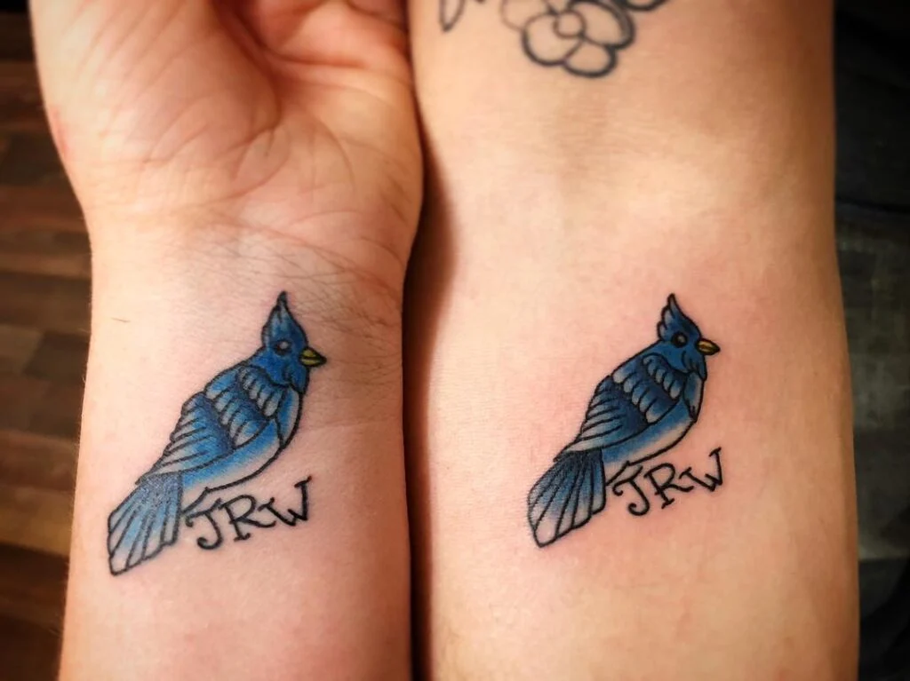 Placed on their wrists, the design serves as a constant reminder of their bond, much like the blue jay’s symbolic message of devotion and togetherness in nature.