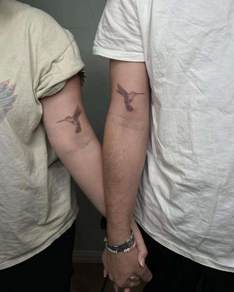 This couple’s matching tattoos feature delicate hummingbirds, symbolizing love, freedom, and resilience. Positioned on their arms, the birds appear to be flying toward each other, representing their deep connection and devotion. The fine-line detailing and subtle shading create an elegant and timeless look.