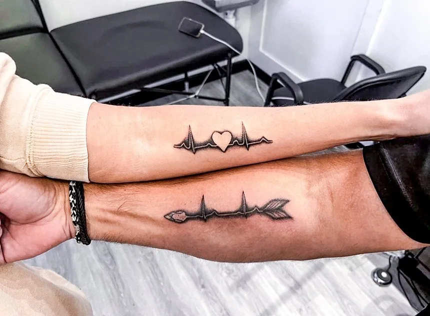 This couple’s matching tattoos combine heartbeat lines with unique elements that represent their connection. The wife’s design features a heart at the center of the pulse, symbolizing love and life, while the husband’s tattoo transforms the heartbeat into an arrow, representing strength and direction. When placed together, these tattoos tell a story of love, passion, and unwavering commitment.