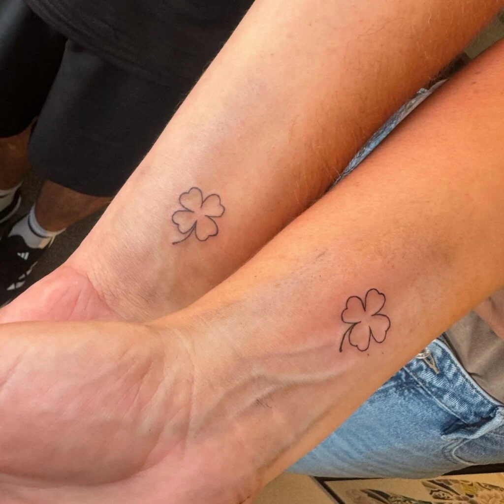 This couple’s matching tattoos feature simple yet meaningful four-leaf clovers, a universal symbol of luck, love, and good fortune. The delicate, minimalist design keeps the focus on their shared belief in positivity and unity.