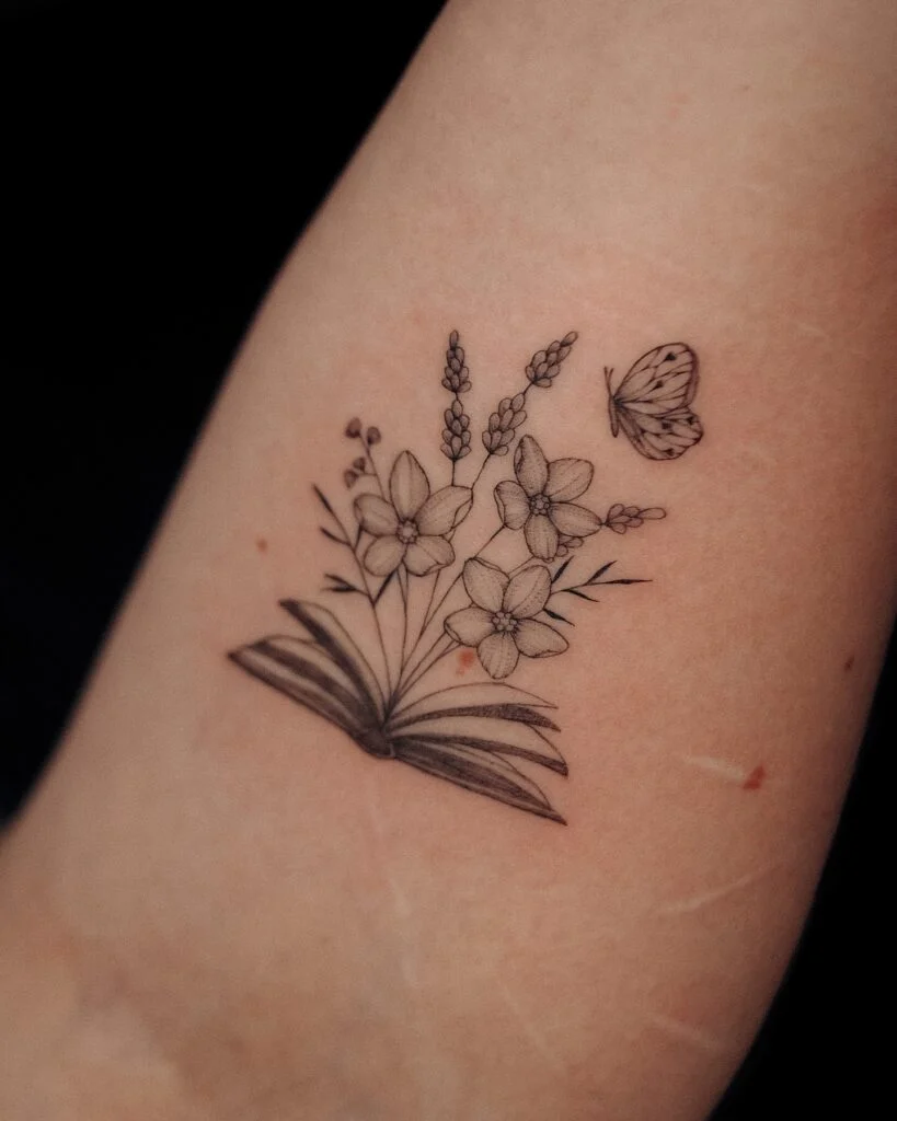 This elegant tattoo features an open book with finely detailed flowers rising gracefully from its pages, accompanied by a delicate butterfly fluttering nearby. The black ink design uses soft linework to create a peaceful and poetic atmosphere.