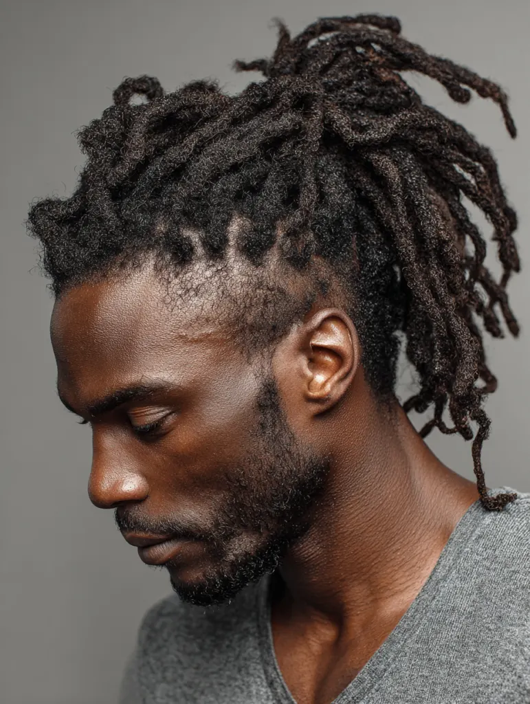 A low ponytail gives locs a practical, neat shape that works for everyday routines. The style pulls the locs back gently, which keeps them controlled without feeling tight. Men with medium or long locs benefit from this option because it organizes length while maintaining natural texture.