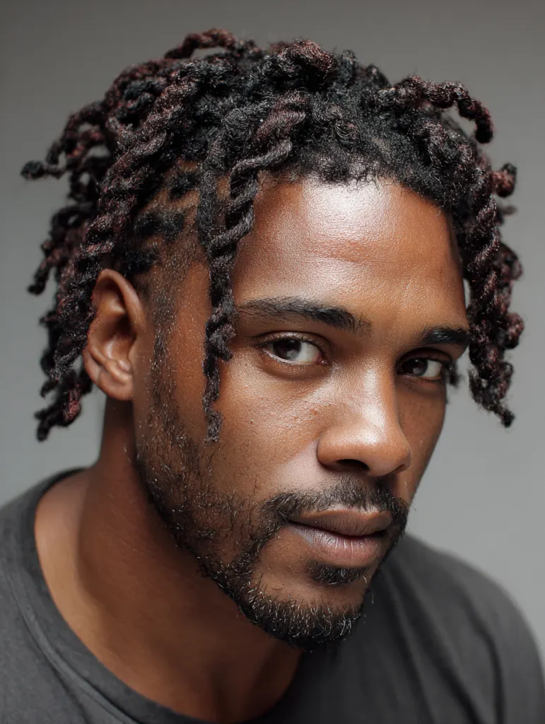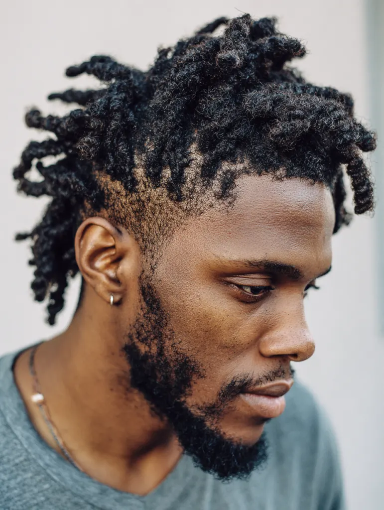 A twist and loc combination style brings texture and definition together by blending freshly twisted sections with established locs. This look suits men who want a transitional style while growing or reshaping their locs. The twists help define new growth while the mature locs maintain structure.
