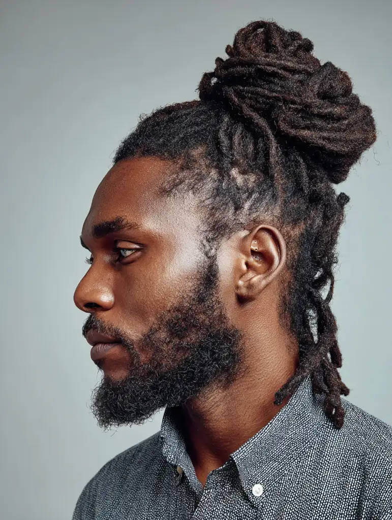 Locs styled into a high bun offer height and structure because the bun gathers the length into a strong focal point. This style works best for men with medium or long locs that can wrap securely. The high placement draws attention upward, which helps elongate the face.