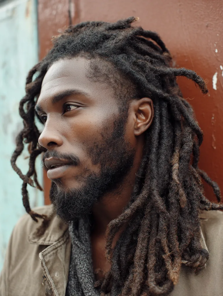 Long flowing locs create a striking look because the length adds presence and movement. This style suits men who want something expressive that grows with time and patience. Longer locs frame the face naturally, which softens sharp features while enhancing overall structure.