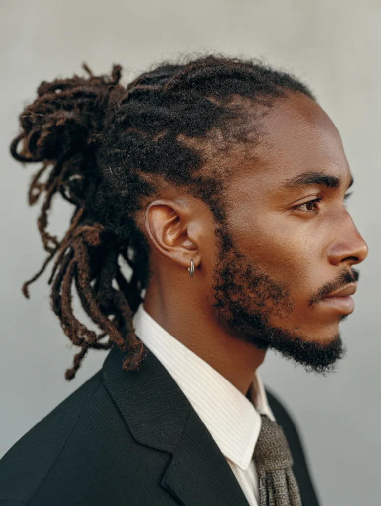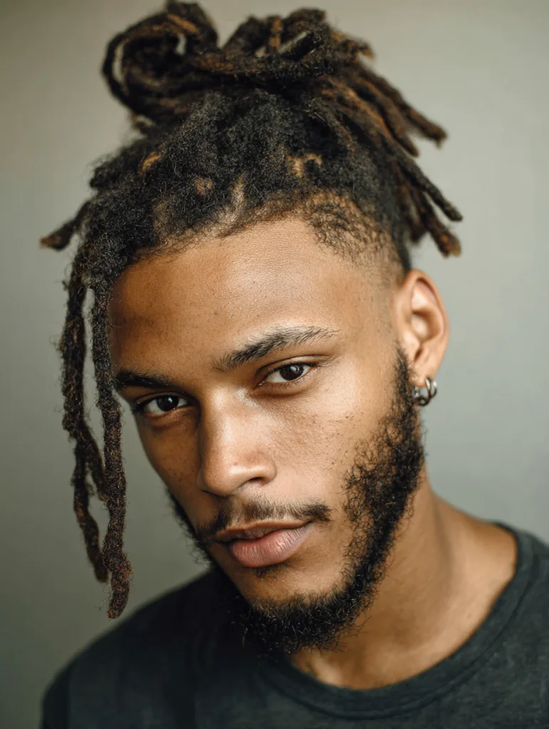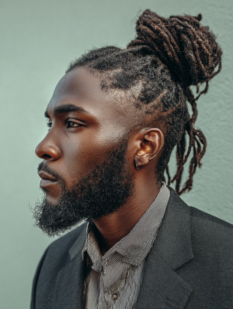 A half-up bun with locs offers a blend of control and freedom because it keeps the top secure while letting the rest flow. This style works well for medium or long locs and suits men who want something practical for daily tasks. The bun adds height, which helps balance round or softer face shapes.