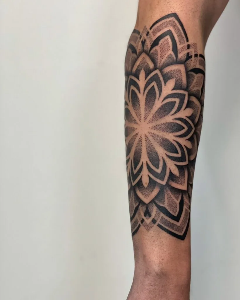 This stunning forearm tattoo features a large mandala centerpiece composed of layered petal shapes and intricate dotwork shading. Surrounded by geometric borders and smaller mandala patterns, the design radiates outward with perfect symmetry and balance.