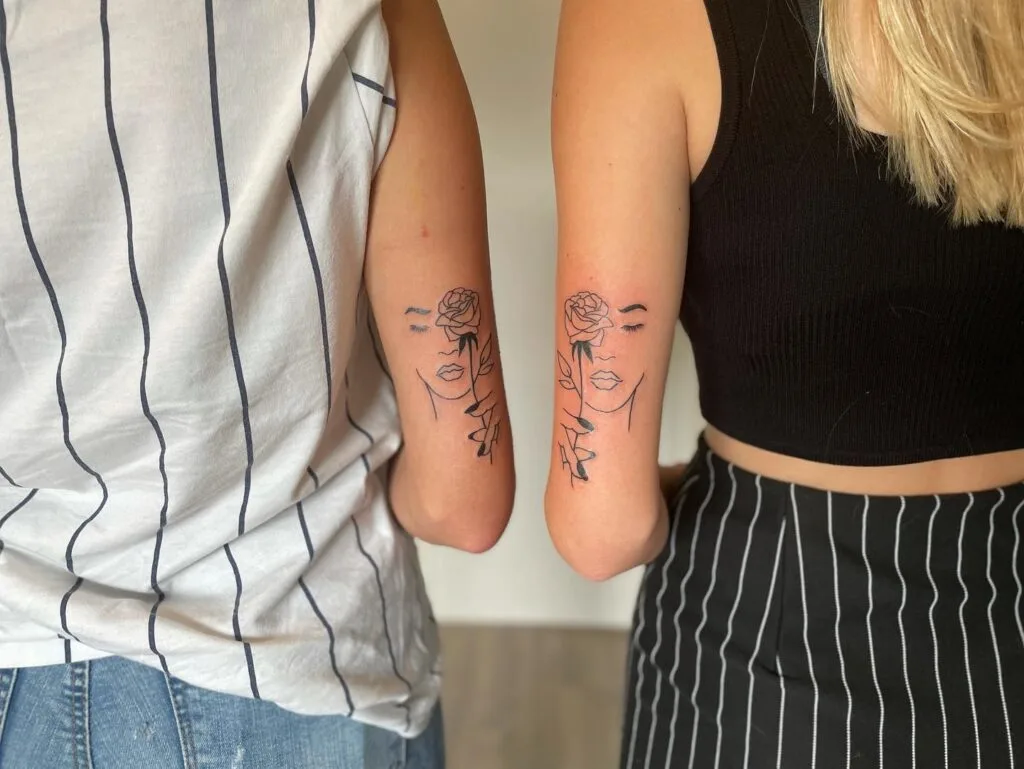 2. Matching Line Art Face and Rose Sister Tattoos