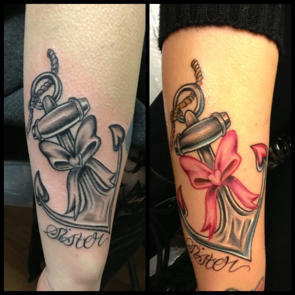 These matching anchor tattoos symbolize the strength and stability of the sisterly bond. Each anchor is adorned with a bow—one in black and white, and the other in color, reflecting each sister’s unique personality. The word “Sister” elegantly ties the design together, emphasizing the connection between them.