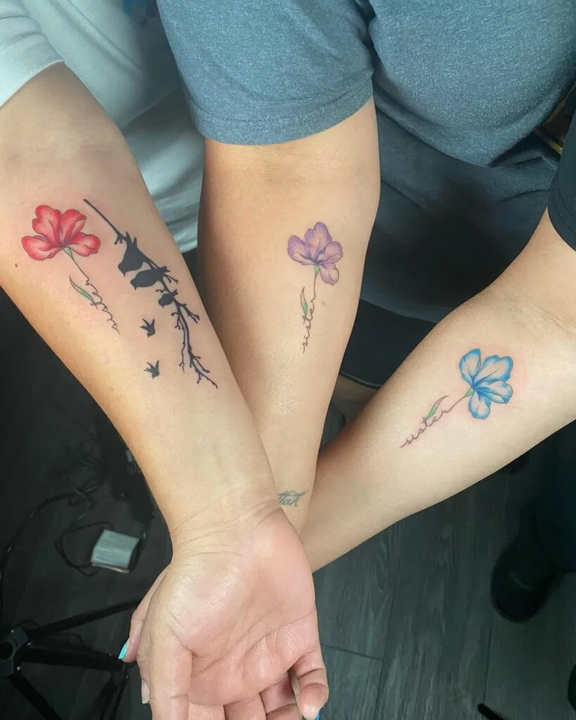 The flowers’ varied colors—red, purple, and blue—might represent the different personalities or the special memories each sister holds dear. This tattoo design is perfect for sisters who want to express their connection through a floral theme, combining the beauty of nature with the strength of their relationship.