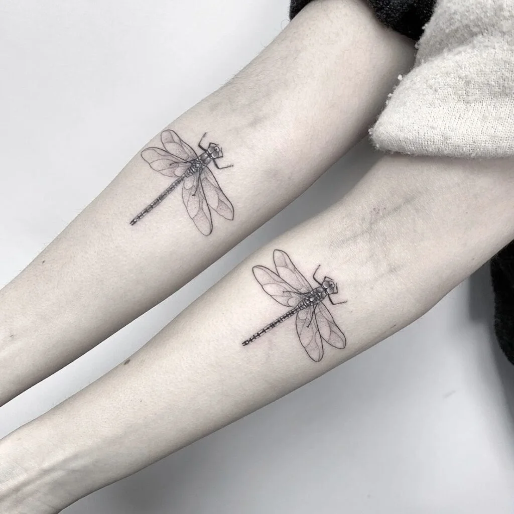 Dragonflies are also often associated with self-realization and emotional maturity, reflecting the deep bond and understanding that sisters share. These tattoos are a beautiful way for sisters to celebrate their journey through life, honoring their connection with a design that is both meaningful and visually stunning.