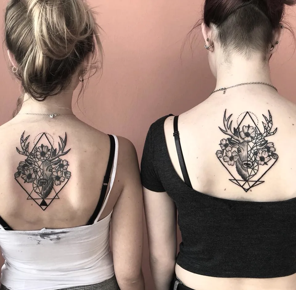 These stunning sister tattoos feature a beautifully detailed deer head adorned with intricate flowers, set against a geometric background. The design symbolizes a blend of strength, grace, and natural beauty, reflecting the qualities that each sister sees in the other.