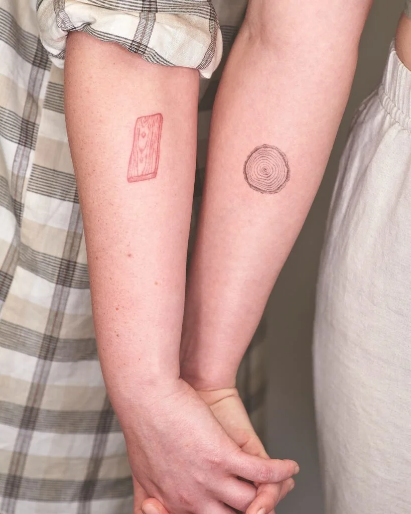 The other tattoo displays a wooden plank pattern, representing strength and resilience. Together, they tell a story of a bond that has grown and strengthened over time, just like the trees from which they draw inspiration. These tattoos are perfect for siste