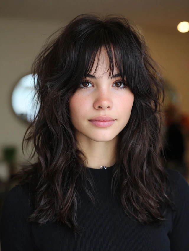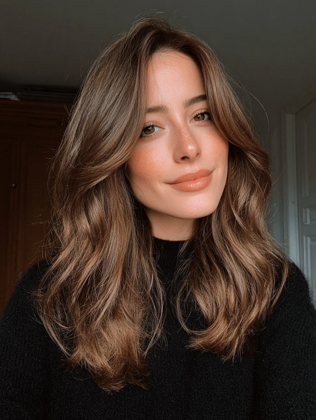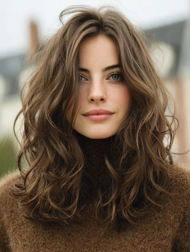 Wavy layers highlight natural symmetry. This style adds softness without changing face proportions. Medium to thick hair holds waves well. Layers prevent heaviness at the ends.