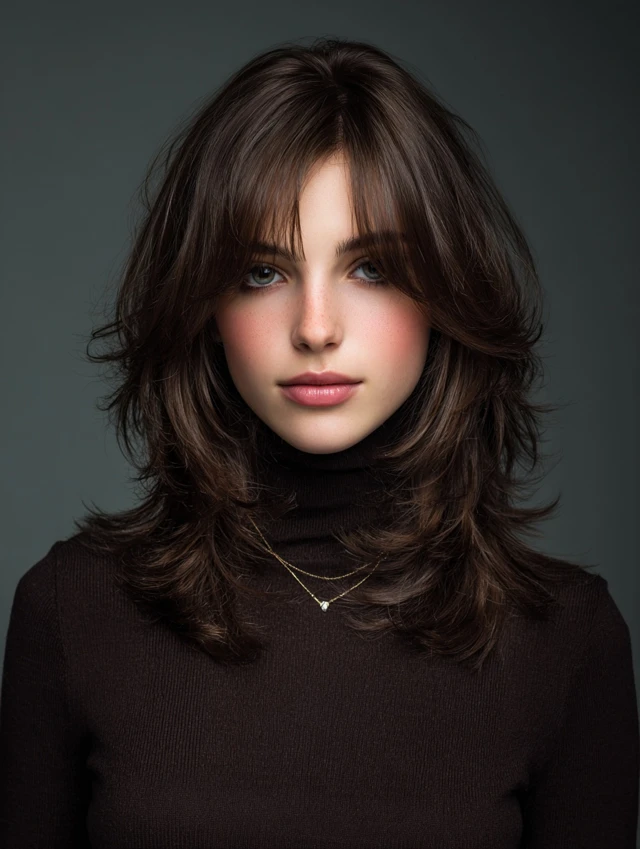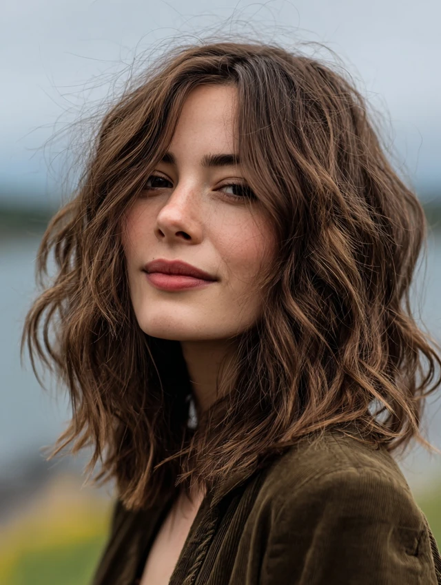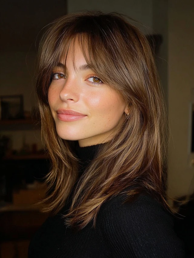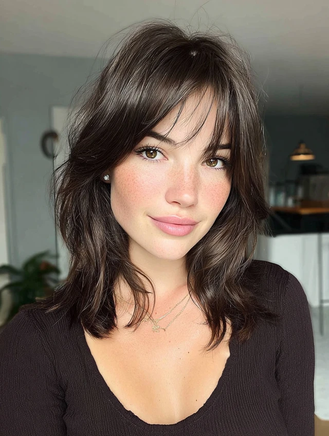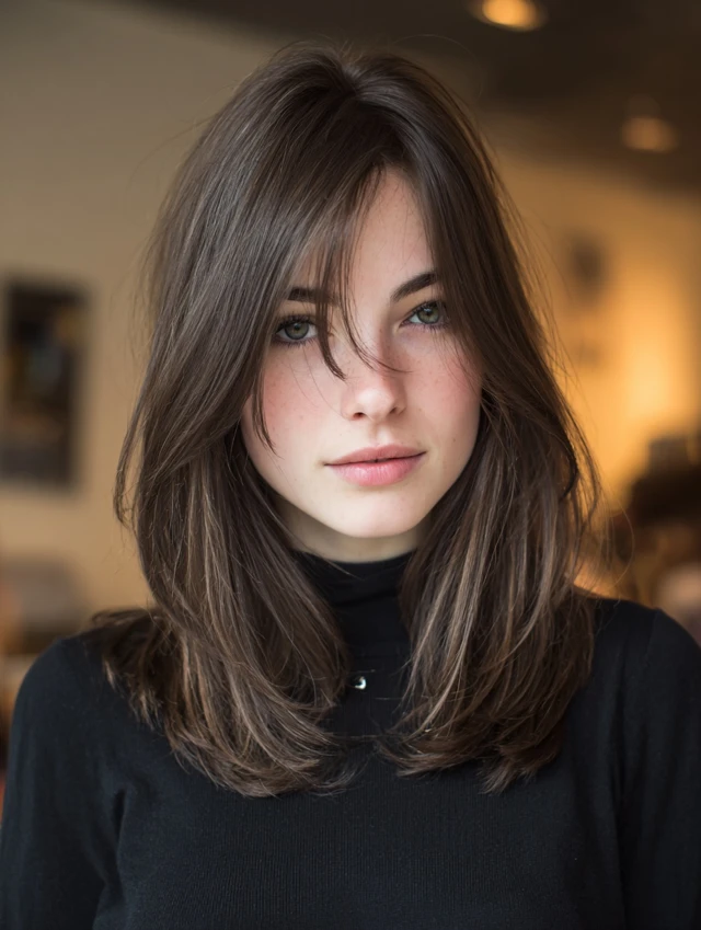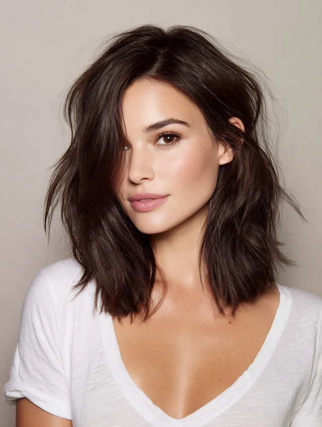 A layered shoulder-length cut adds movement without changing your face shape. It highlights cheekbones and keeps the jawline soft. Fine hair benefits from subtle layers for lift, while thick hair feels lighter with internal layering.