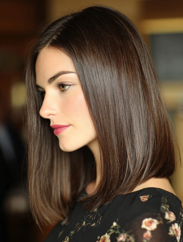 Flat iron for a sleek look. Or add subtle bends for texture. This cut fits professional environments and polished settings. It stays structured with minimal daily styling.