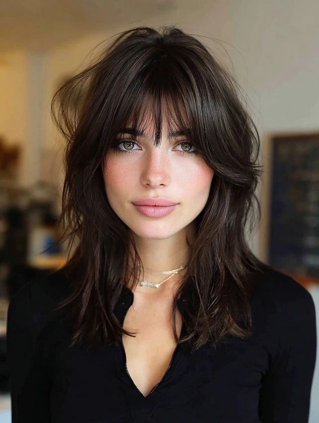Blow-dry bangs across the forehead for shape. Keep the rest slightly textured. This style transitions well from work to evening. Trim bangs regularly to maintain framing.