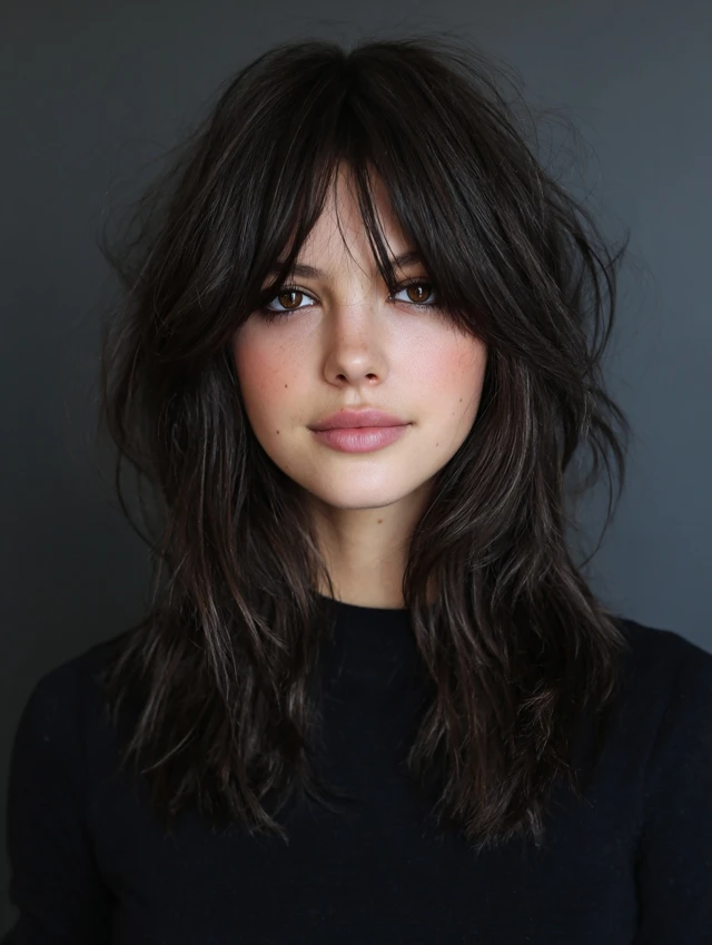Curtain bangs frame the face evenly. They enhance the symmetry of an oval shape. This style works well with straight or slightly wavy hair. The bangs blend into the layers without crowding the face.
