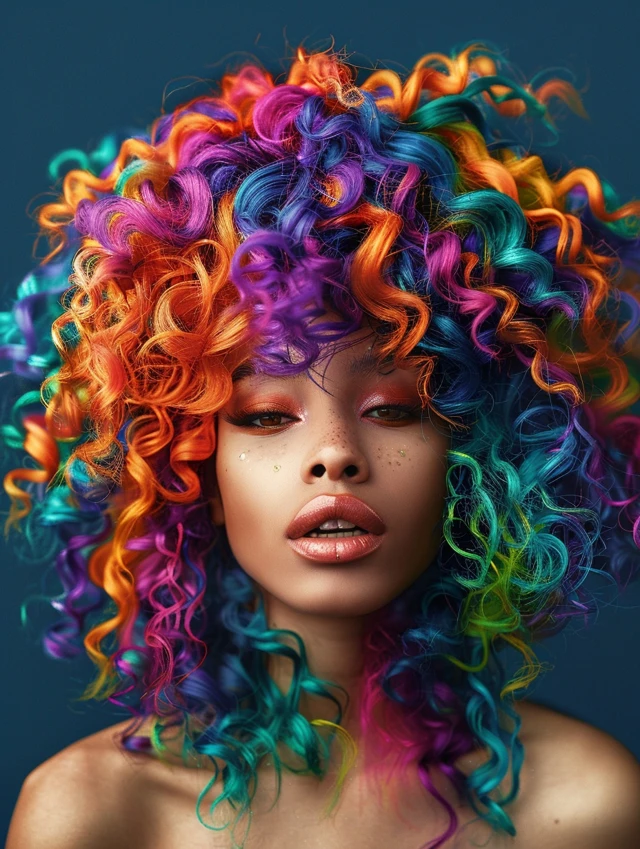 Perfect for creative events or cosplay. Apply temporary or permanent color, keeping curls defined. The style combines bold texture and vivid shades for a fearless, high-impact look.