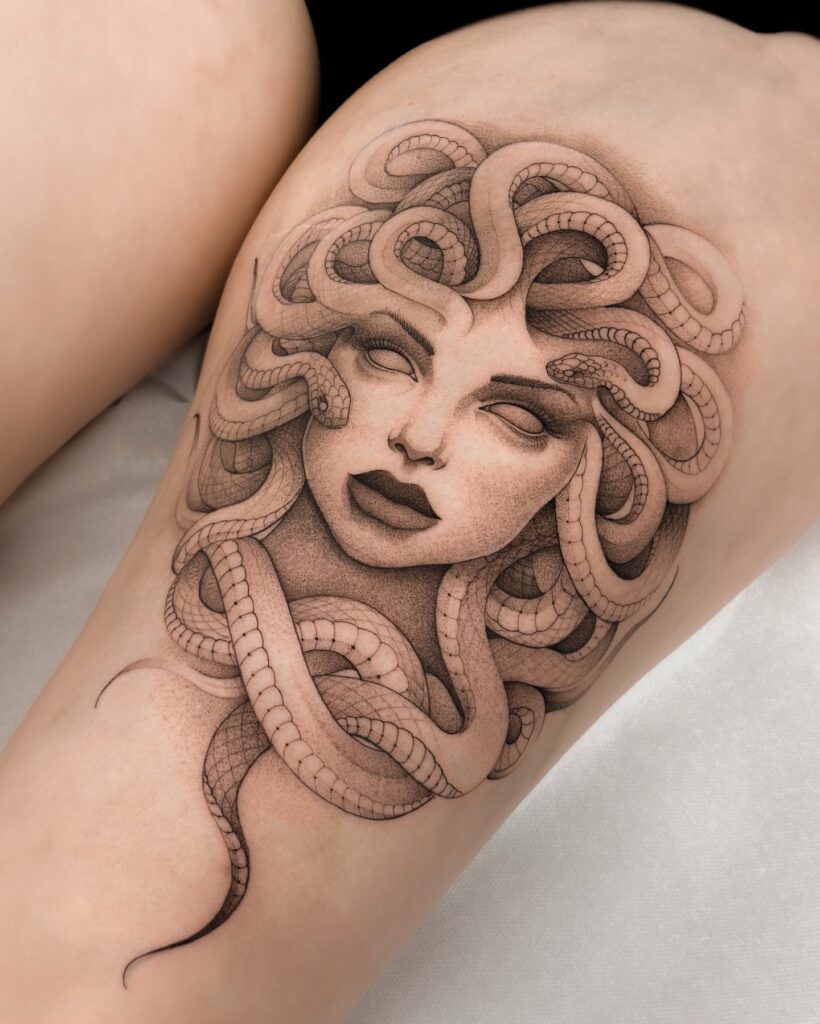 Each serpent curls naturally, showing clean scales and gentle contrast that enhance the design’s flow. The placement highlights the curves of the body, making the tattoo feel balanced and sculpted. This piece works well for someone who prefers a detailed Medusa tattoo with a soft, artistic look that still feels strong and expressive.