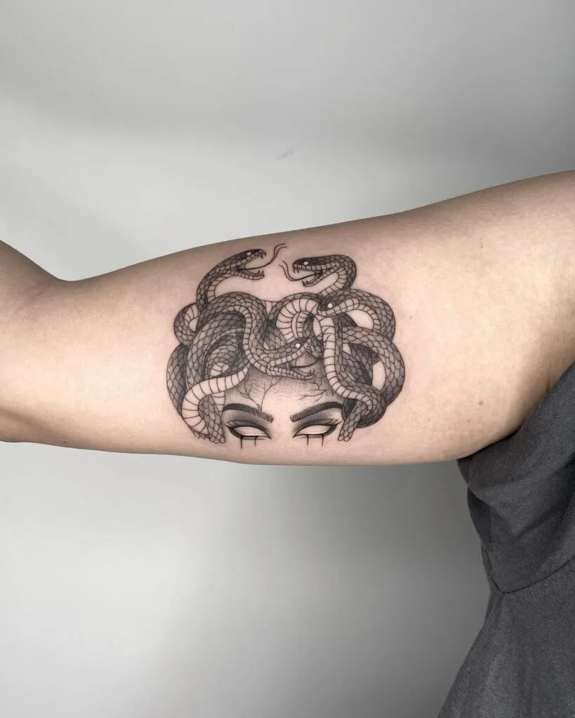 Snakes weave through her hair and wrap around her arm, showing clean scales and smooth shading that enhance the flow. Her relaxed hand placement softens the overall look. This tattoo works well for someone who wants a feminine Medusa design that blends elegance, mystery, and subtle movement.