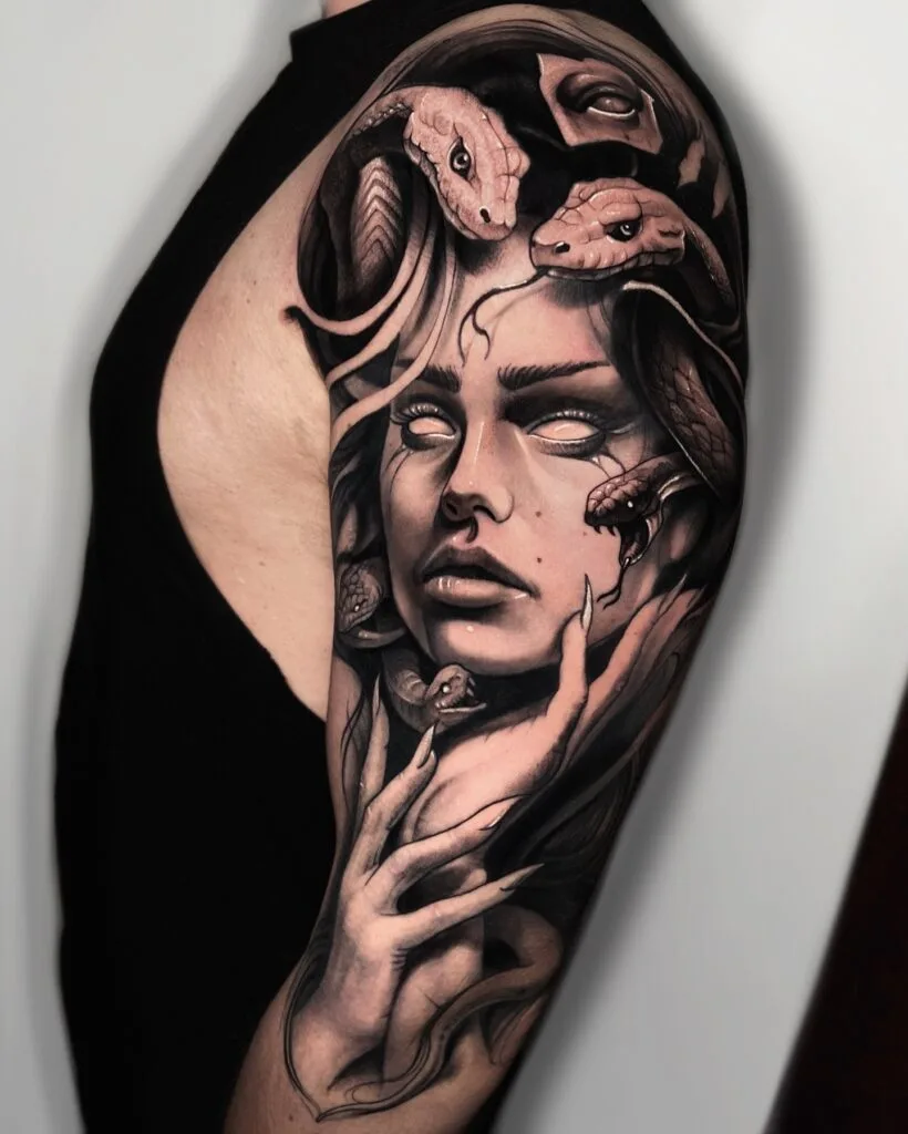 Each serpent appears alert and expressive, creating movement across the shoulder and upper arm. Her long fingers frame her face, guiding the viewer’s eye toward her intense expression. The bold shadows and lifelike details make this tattoo a strong choice for someone who wants a dark, striking, and highly detailed Medusa design.