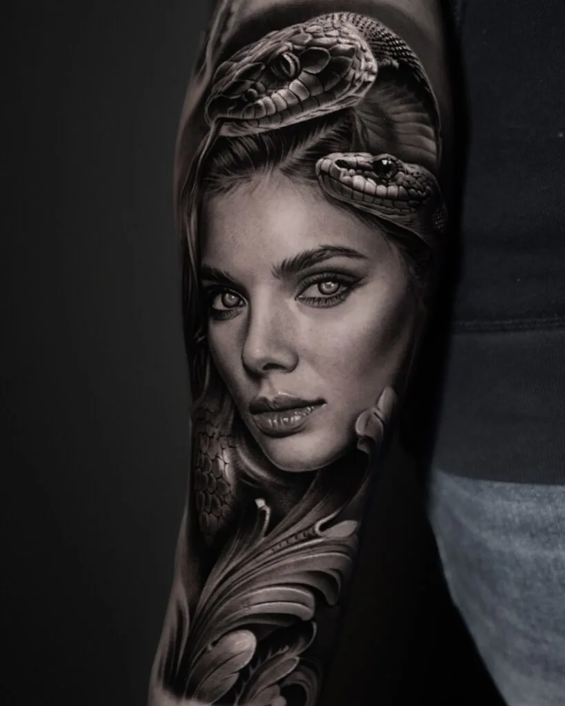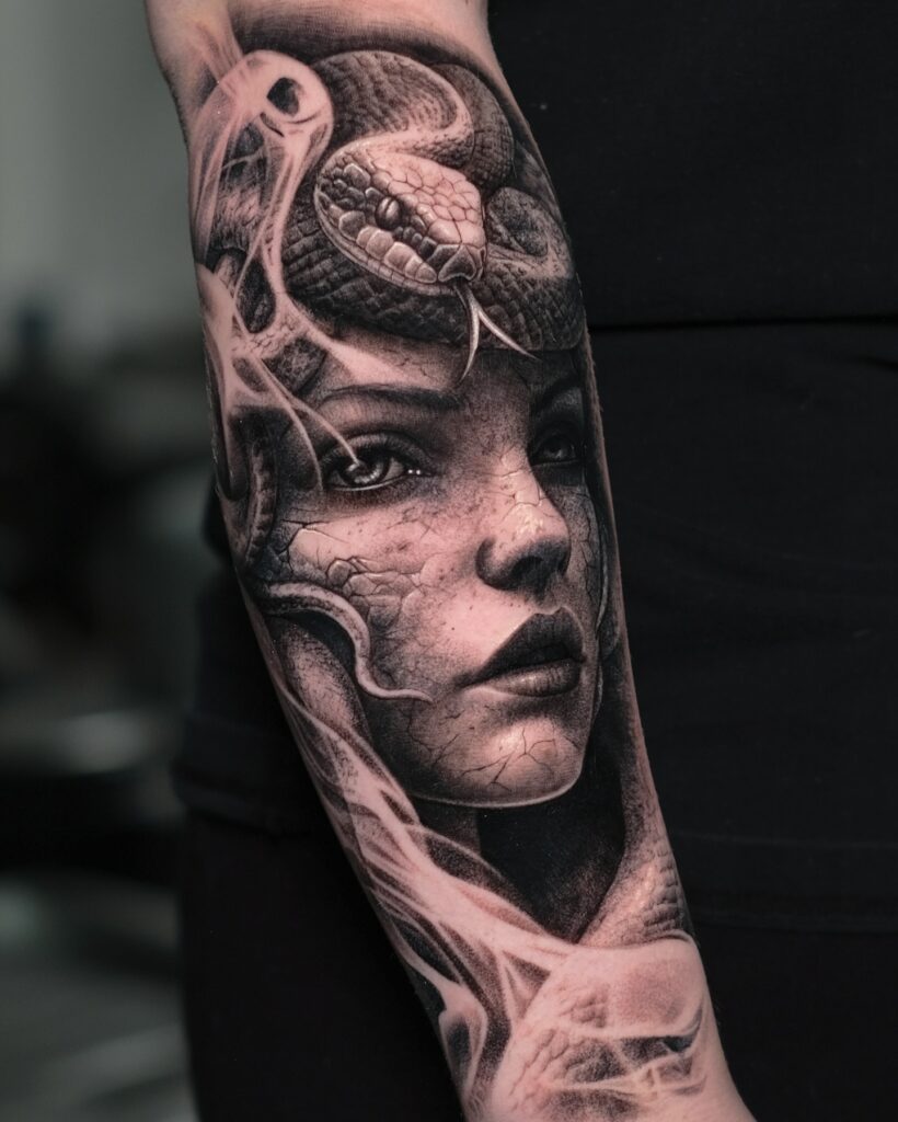 This Medusa tattoo shows a highly realistic portrait paired with a detailed snake wrapped across her forehead. The artist used smooth shading to create lifelike skin texture, including subtle cracks that make her look ancient and powerful.