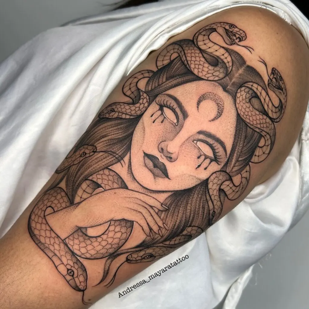 Snakes weave through her hair and wrap around her arm, showing clean scales and smooth shading that enhance the flow. Her relaxed hand placement softens the overall look. This tattoo works well for someone who wants a feminine Medusa design that blends elegance, mystery, and subtle movement.