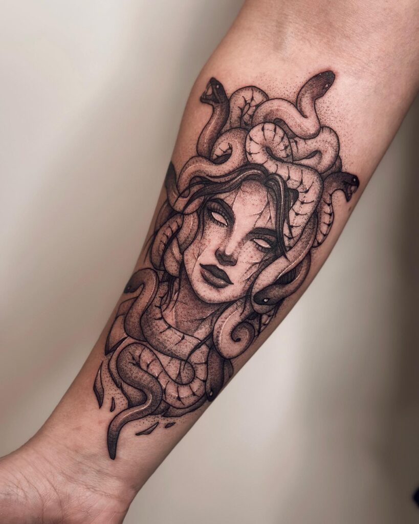 Subtle cracks across her face strengthen the mythological feel. This design suits someone who wants a striking Medusa tattoo that blends beauty, strength, and mystery in one bold forearm piece.